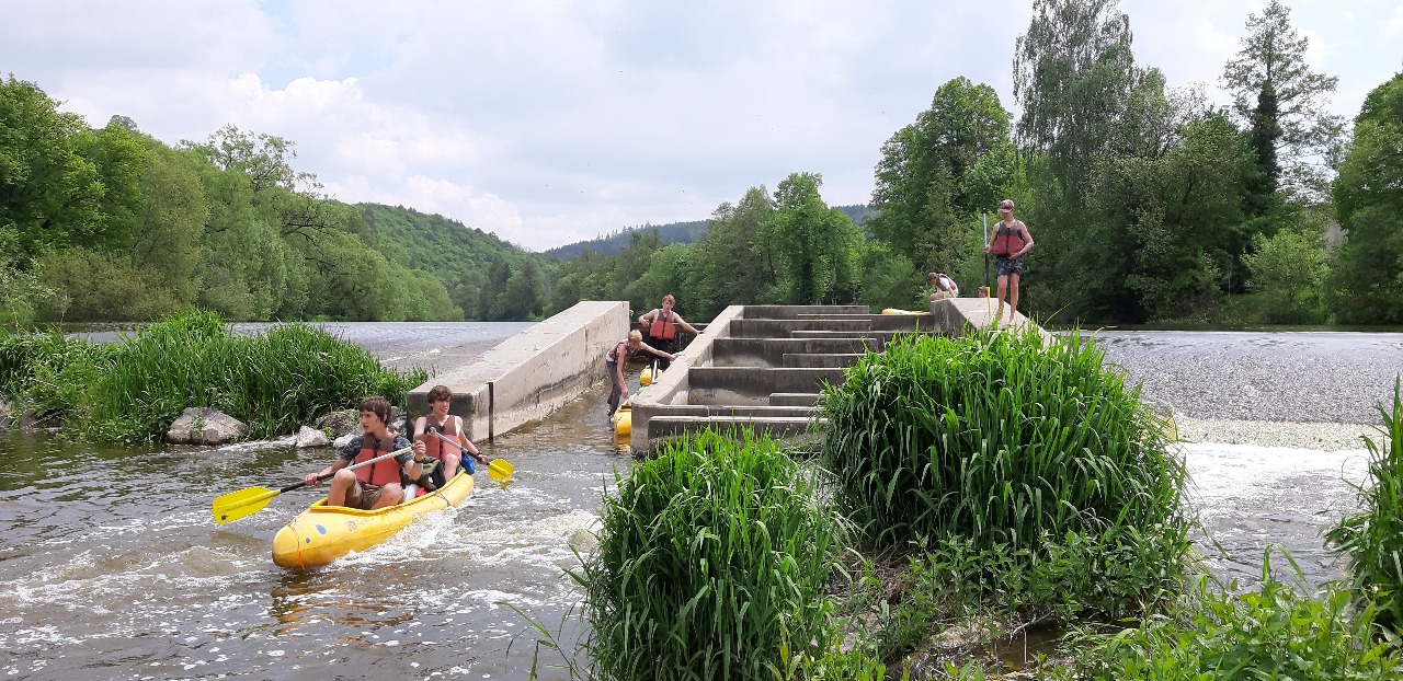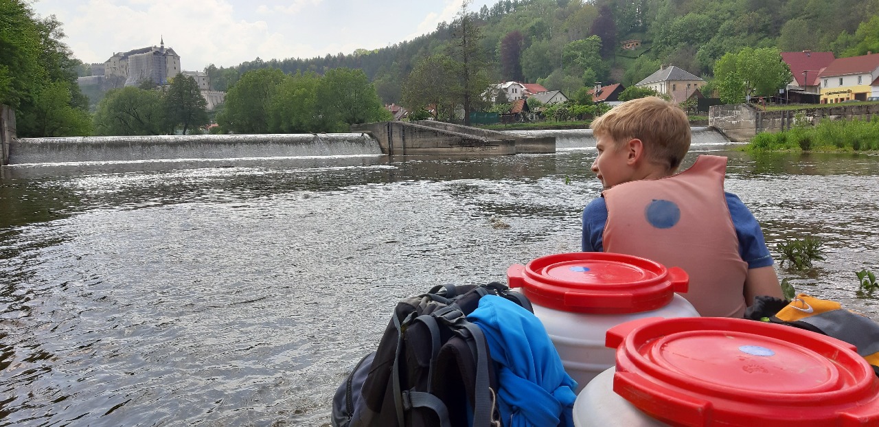 Ráno nám dělá budíček stavba vedle, jedou už cca od 7, ale ze stanů se vylézá až po 8. Snídáme masňácky až do 9,00 kdy otevírají půjčovnu. Nafasujeme výbavu a čeká nás téměř hodinové martyrium s přebalováním do barelů. Hlavně mladší, co jim maminky nabalily troje boty a dvě bundy mají trable. Nakonec se vše podaří, dáme krátké školeni, rozdělíme posádky a vyrážíme. První jez Pelíškův most se jet nedá, šlajsny jsou ještě zavřené, takže musíme přenášet. Drbu si hlavu že jsme nevzali provazy na koňadru kvůli stahování lodí. Takhle musíme tahat po břehu.